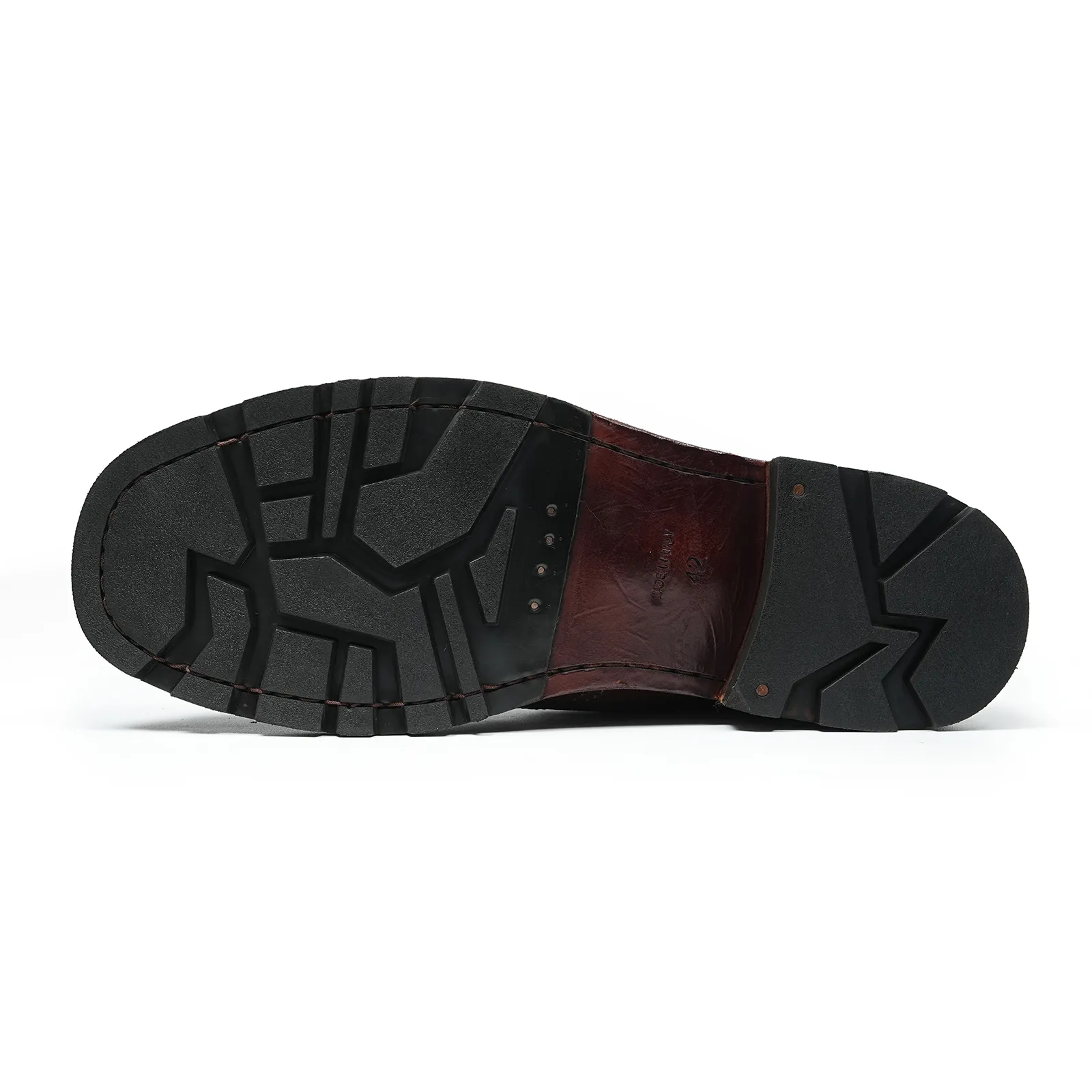 ④ Solid Rubber + Leather Outsole for stability and long-lasting wear